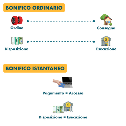 Per capire qual è questa differenza, pensa ad un bonifico ordinario come all’acquisto di un prodotto online.